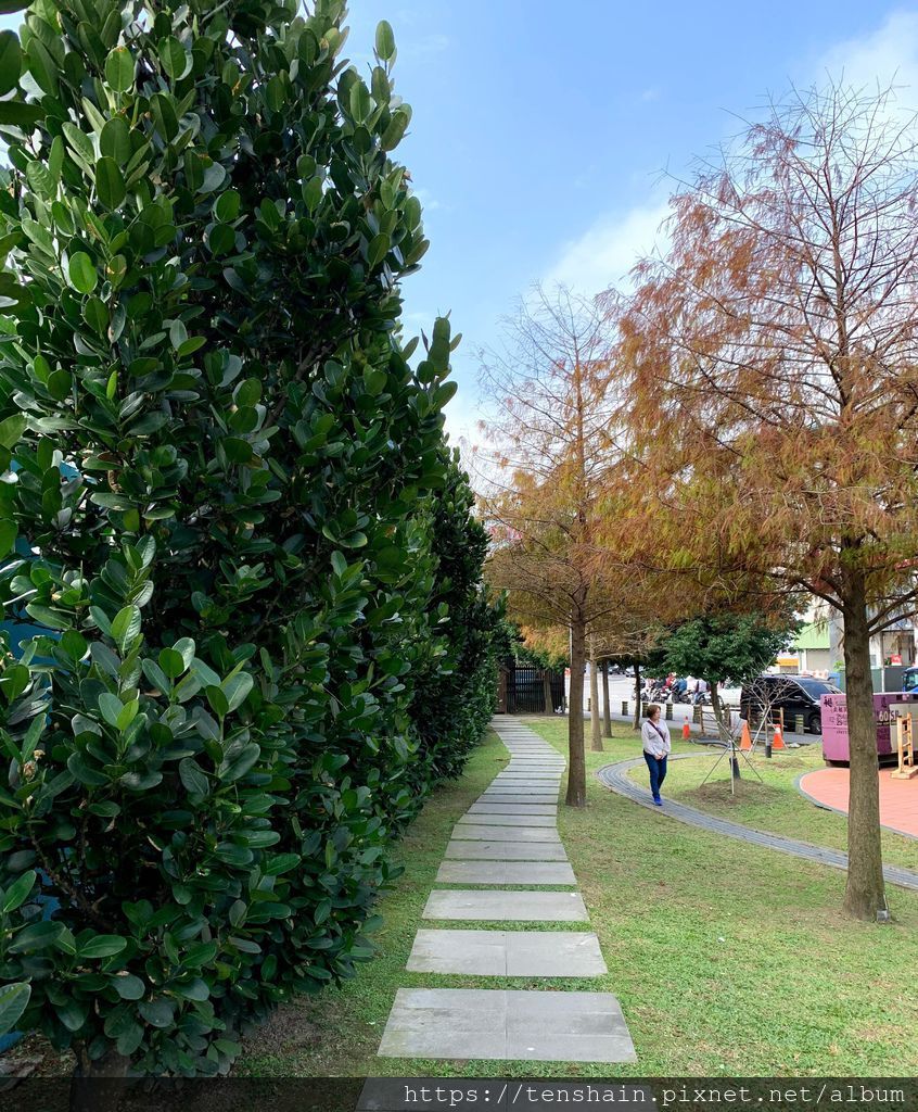 除了和櫻花合照之外,樂活公園裡,這一排挺拔的菲島福木牆,還有落羽松,也是很好的拍照打卡素材。