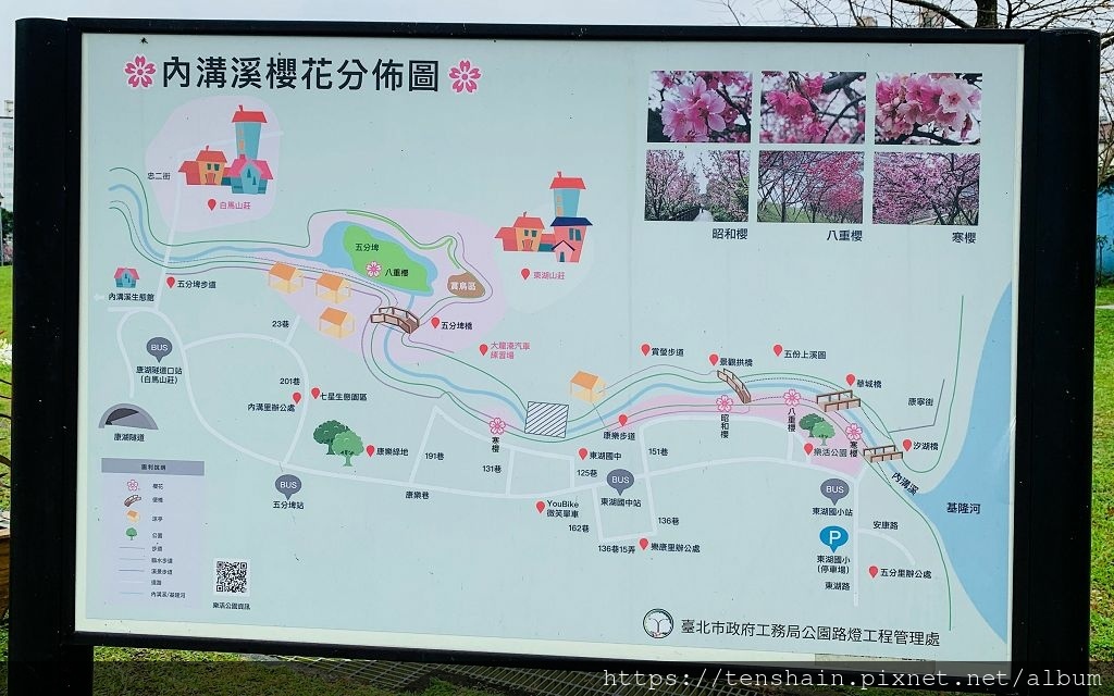 為什麼?因為搭捷運過來,你得在東湖站下車,然後沿東湖路走到樂活公園。再從樂活公園開始,沿著內溝溪旁的步道賞花,一路走到忠三街口 ( 瓏山林大門口 ) ,再沿原路折返。這樣的話,等於從樂活公園到忠三街口這一條路要走兩趟。雖然賞花的路徑,其中有一段是內溝溪的兩岸都有櫻花可賞,但是對於體力比較不好的朋友,或是不想走回頭路的朋友來說,這樣的路線並不是很理想。