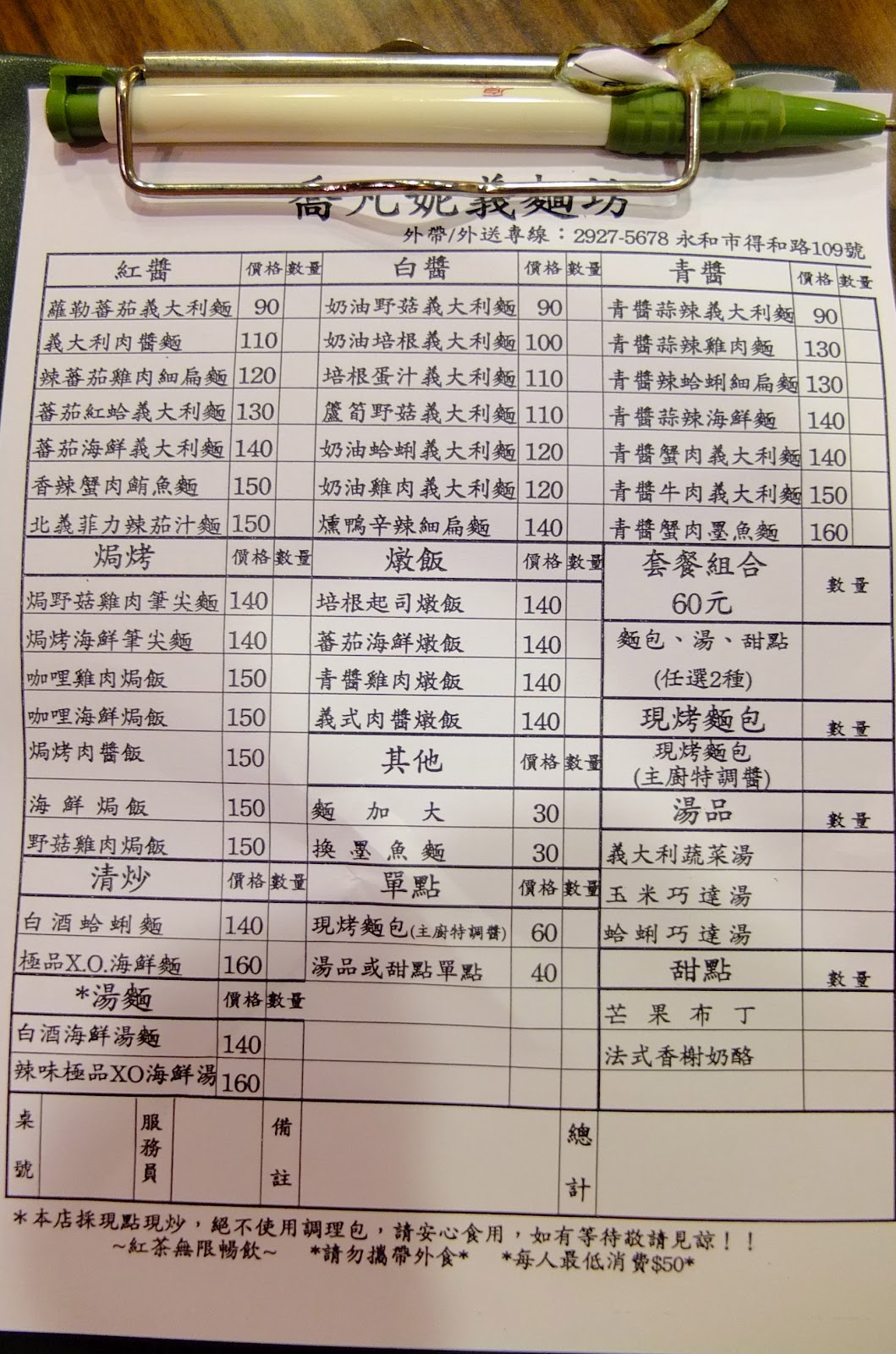附上點菜單讓大家瞧瞧。在永和中正路、得和路口想吃平價好料,喬凡妮義麵坊可以列入名單內噢~