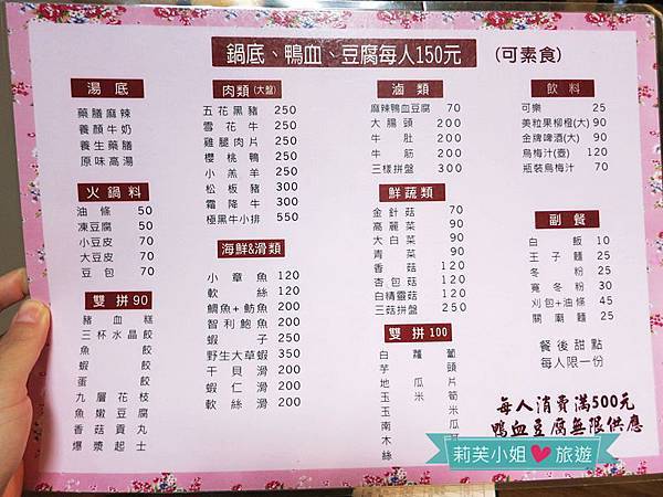 菜單如下,磚腳麻辣鍋的消費方式跟鼎王很像,都是以單點式的點餐,鍋底、鴨血跟臭豆腐每人酌收150元,每人消費滿500元則鴨血臭豆腐無限供應。