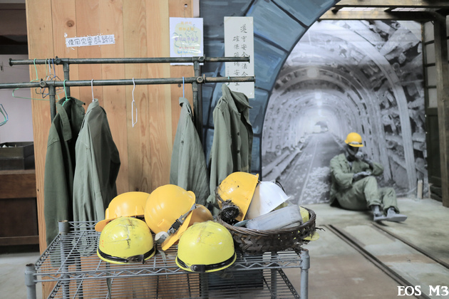 文物館一樓有座模擬影像的礦坑,大家可以借穿礦工衣服與器具,合影留念。