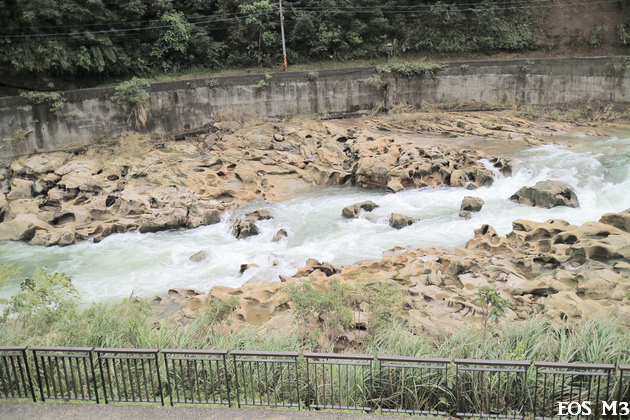 坐在觀景平台上,可俯瞰潺潺基隆河水,是如何經年累月的沖刷砂岩,形成特殊壺穴地形。