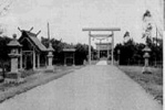如圖所示,可以注意到園區內的道路呈現類似「甲」字,這正是舊的神社周邊與參道的遺跡。新莊神社舊照如下:
