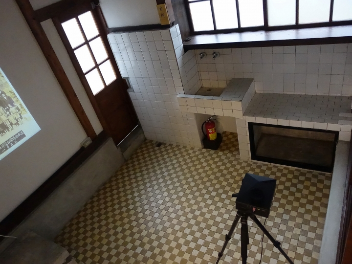 現在展示故居簡介及屋頂斜脊上的雲形鬼瓦、隔間拉門(襖)上的舊和紙、有字的瓦片、彈殼等文資的空間。