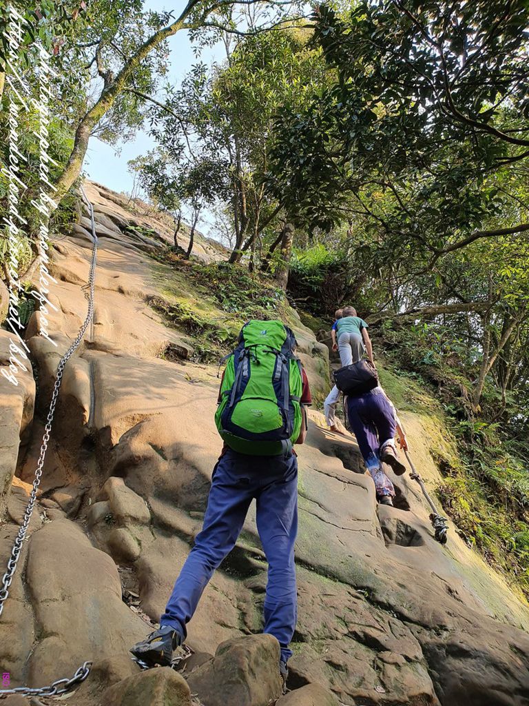 很多路段需要手腳並用拉繩索攀爬而上