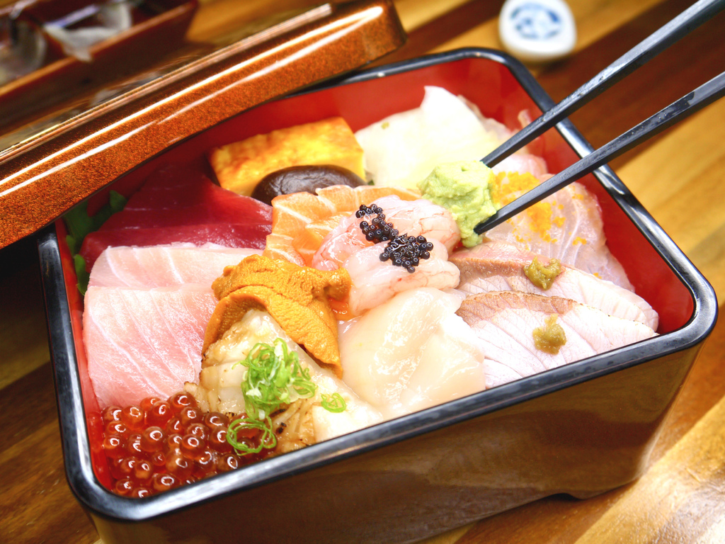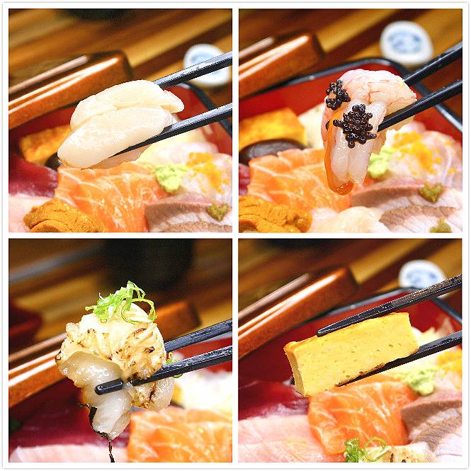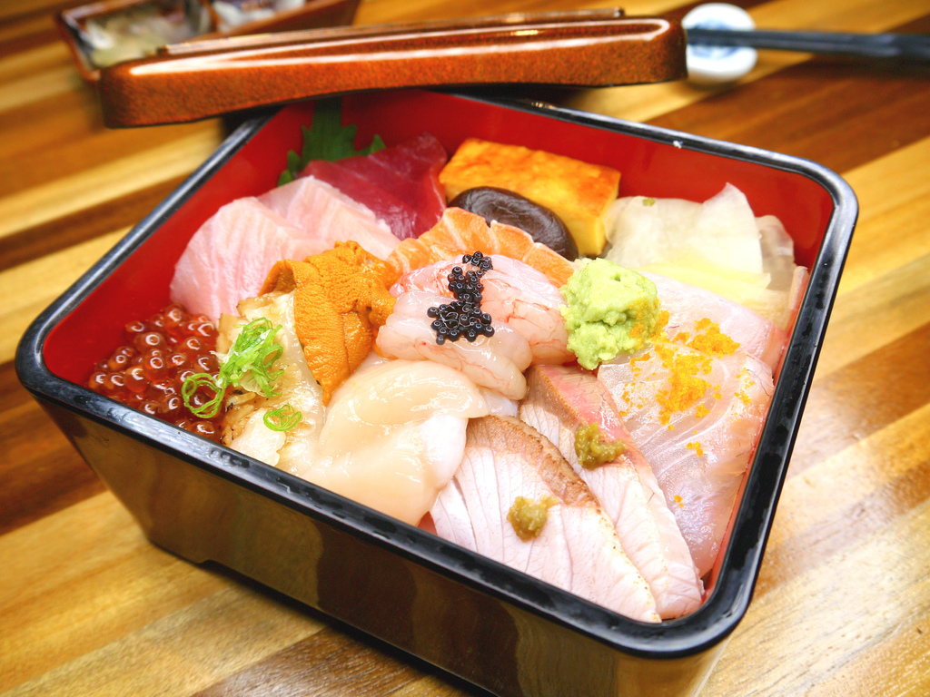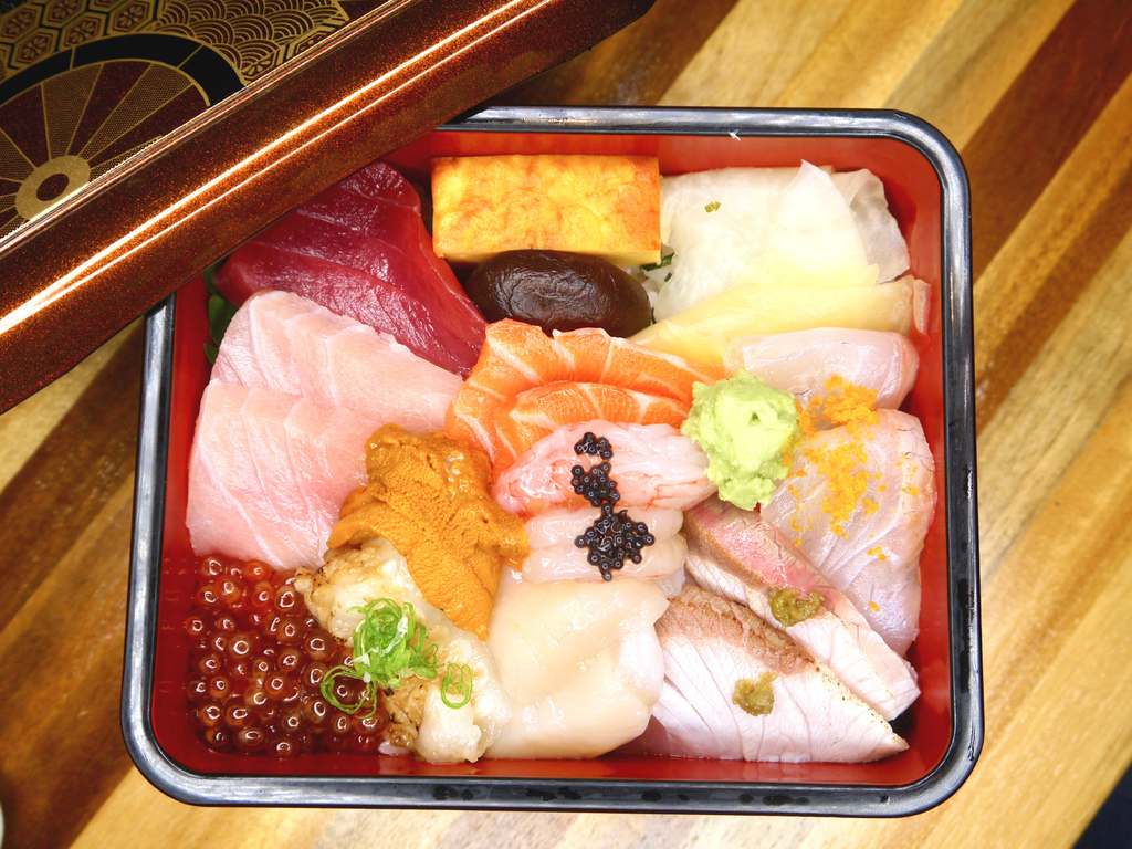 刺身丼包含著長崎黑鮪魚、旗魚、鮭魚、馬糞海膽、