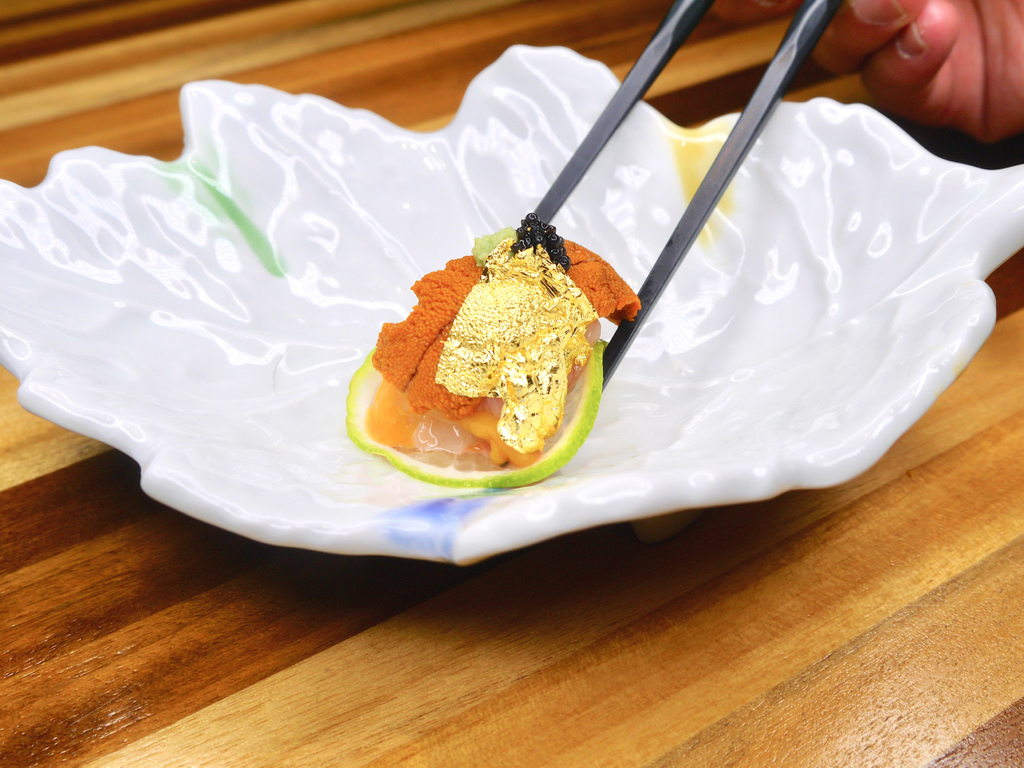 陸續將金箔、黑鮪魚泥、海膽、鮭魚卵和魚子醬緊密結合,