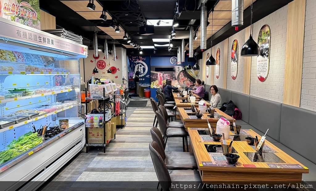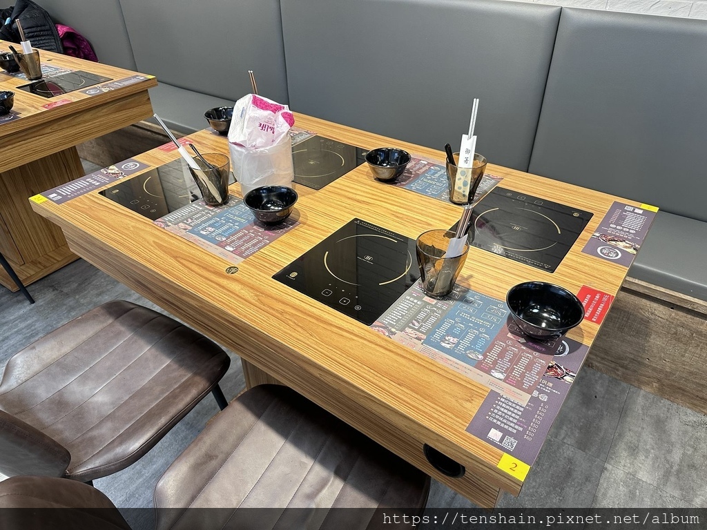 店面空間不大,全部都是 4 人桌設置,用餐採一人一鍋方式,每個人都能自己煮自己喜歡的食材,不用互相牽就彼此的喜好,這點我很喜歡。因為可以升級火烤兩吃,為了避免烤肉的油煙味殘留在客人身上,因此在每桌上方都加裝抽煙設備,非常用心!
