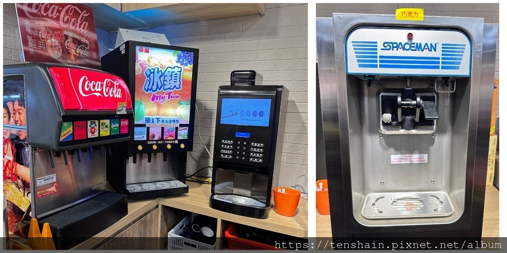 飲料吧冷熱飲都有,冷飲有常見的可樂、雪碧、檸檬紅茶、蘋果汁、水果風味茶;還有我沒喝過的萊姆氣泡水、蘋果風味輕醋飲、芭樂風味綠茶。熱飲有美式咖啡、義式咖啡、拿鐵咖啡、卡布奇諾、摩卡咖啡、巧克力牛奶等。冰品也沒有缺席,巧克力霜淇淋隨你吃到爽。