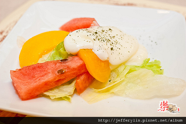 首先上菜的是所謂的"水果優格沙拉", (如上圖), 就幾片生菜、一點水果, 再淋上少許的優格, 如此而已, 很陽春, 滋味也不特別, 反正第一道嘛, 再看看~