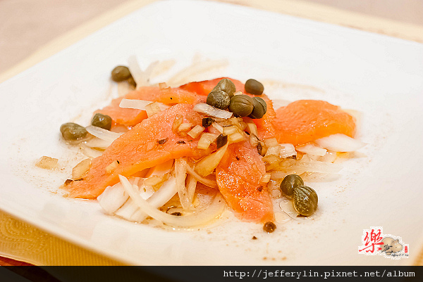 另一道沙拉是"法式油醋燻鮭魚", (如上圖), 也是很簡單, 幾片吃起很普通的燻鮭魚, 底下鋪了點洋蔥絲, 再淋上油醋, 就這樣~