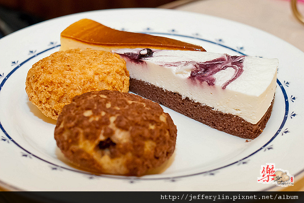 而這一盤由上而下分別是"起士蛋糕、藍莓慕斯、豆酥朋泡芙(原味/巧克力)", (如上圖), 二種蛋糕吃起來的味道也是普普通通, 而那豆酥朋泡芙, 不曉得原本的口感就是這樣嗎? 外皮不酥不脆反而偏軟, 整個口感就是軟軟的, 個人不是很喜歡就是了~
