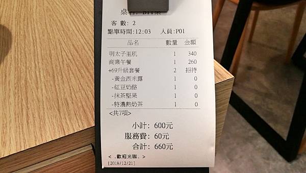 兩個人點了一個明太子里肌豬排(NT$ 340)、商業午餐(NT$ 260),試營運階段,免費送甜點和飲料。