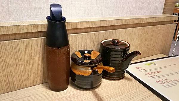 每個桌上有三罐醬料,左起--和風醬、凱薩醋、豬排醬。