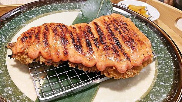 這個豬排有浮誇喔,比我手掌還大片,上面鋪上了明太子醬,火烤的網格為何會出現在上面有點不解,難道是翻過來烤?