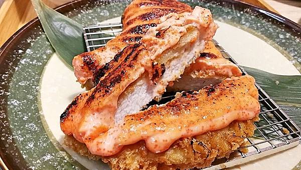 從側面也可以看到紋路清析的里肌肉,上層的粉並不會太厚,倒是上面鋪上的明太子醬頗豐滿。