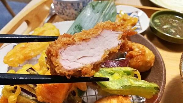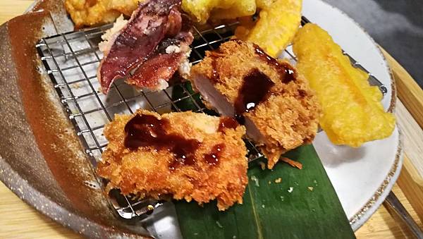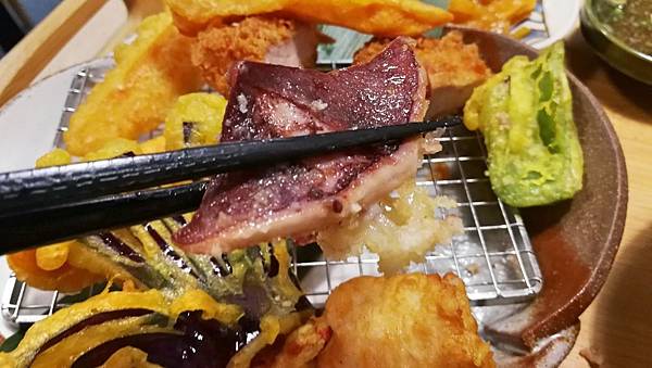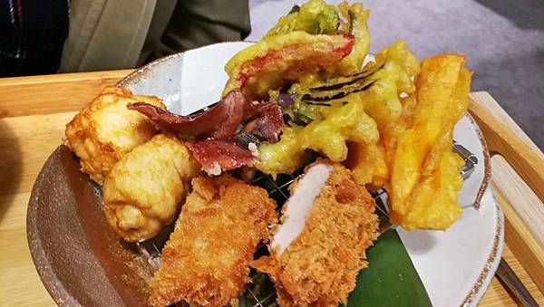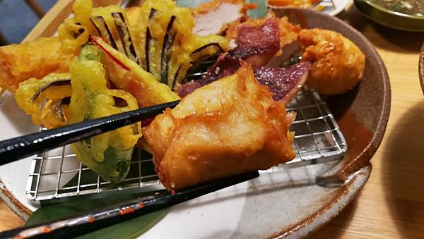 包含腰內肉、雞肉捲、魷魚、還有各種像天婦羅常出現的蔬菜。