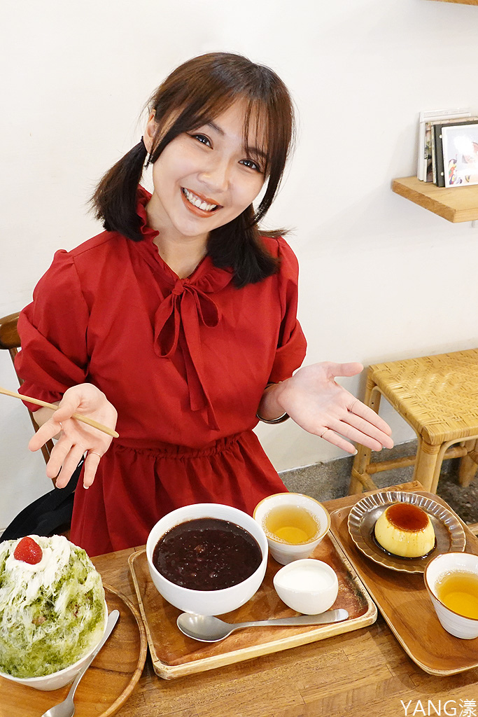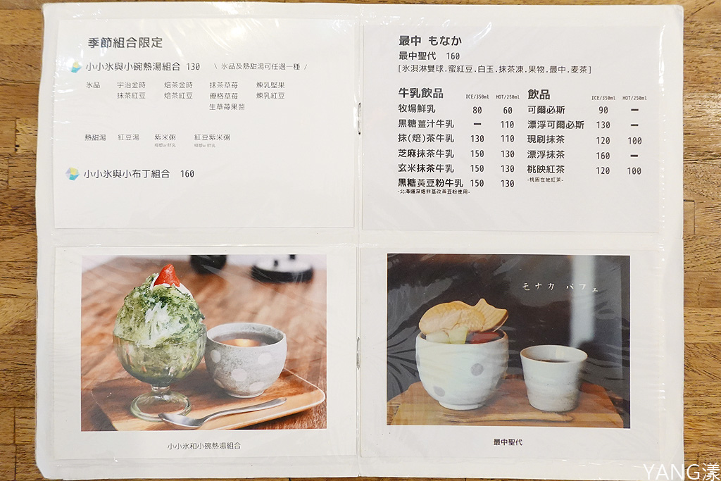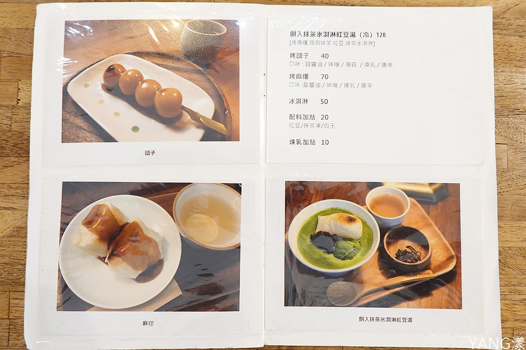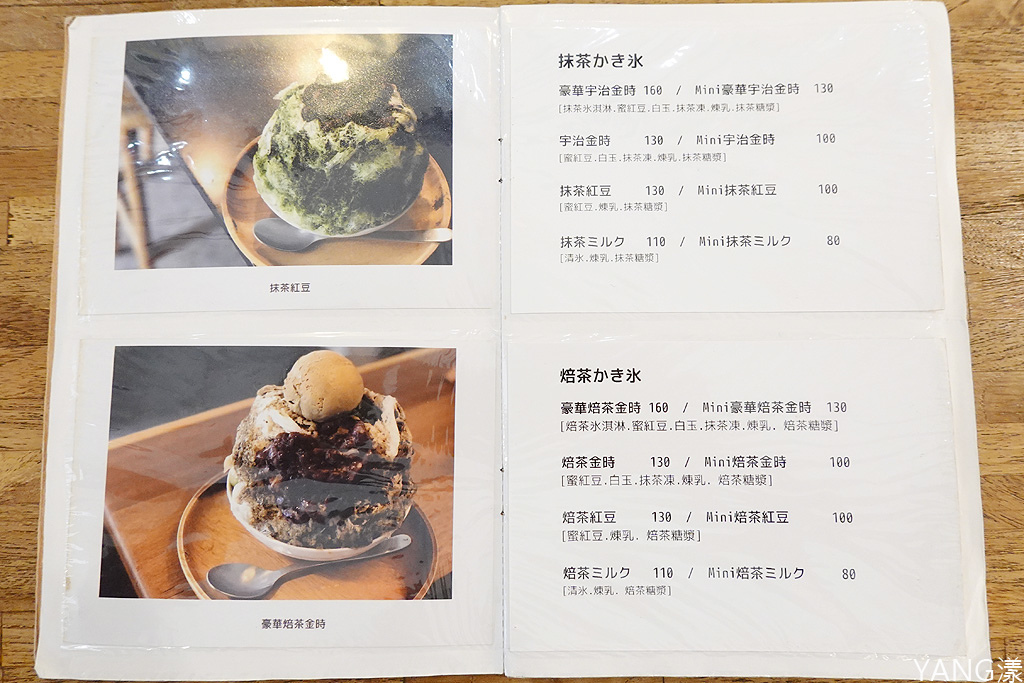 這裡低消是每人一項餐點或飲品,如果客滿就會限制用餐時間為1小時。菜單會隨季節變化,以現場提供的餐點為準。抹茶和焙茶刨冰是店裡招牌,份量分為正常版和mini版,其中宇治金時和焙茶金時最受歡迎。如果是草莓季節時會提供草莓刨冰,秋季就會推出栗子刨冰。烤糰子、烤麻糬或是紅豆湯,也有不少人喜愛。