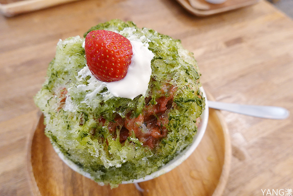 季節限定的抹茶草莓冰,刨冰架上抹茶糖漿及煉乳、草莓醬,再放上一顆大大的新鮮草莓,不只妹子會愛,我個人也很愛。