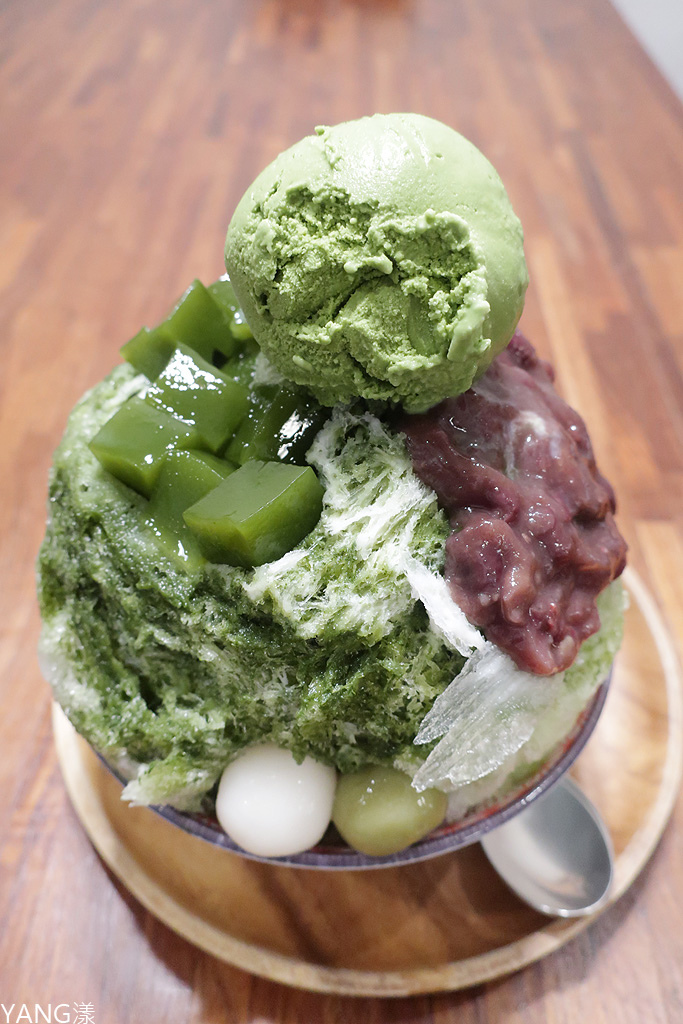 豪華宇治金時正常版,和普通宇治金時的差別在於多了一球抹茶冰淇淋。以白玉為底疊上了層層刨冰,加入抹茶糖漿和煉乳後,再加上蜜紅豆、抹茶凍,最後放上抹茶冰淇淋,高度很嚇人,當然也很不方便吃,如果沒有挖好,可能半座宇治金時山就倒在桌面上了。刨冰很細緻綿密,入口即化,抹茶糖漿的抹茶味很明顯且不甜膩,與蜜紅豆真是完美組合。至於抹茶凍和白玉(湯圓)也算是很稱職的配角。
