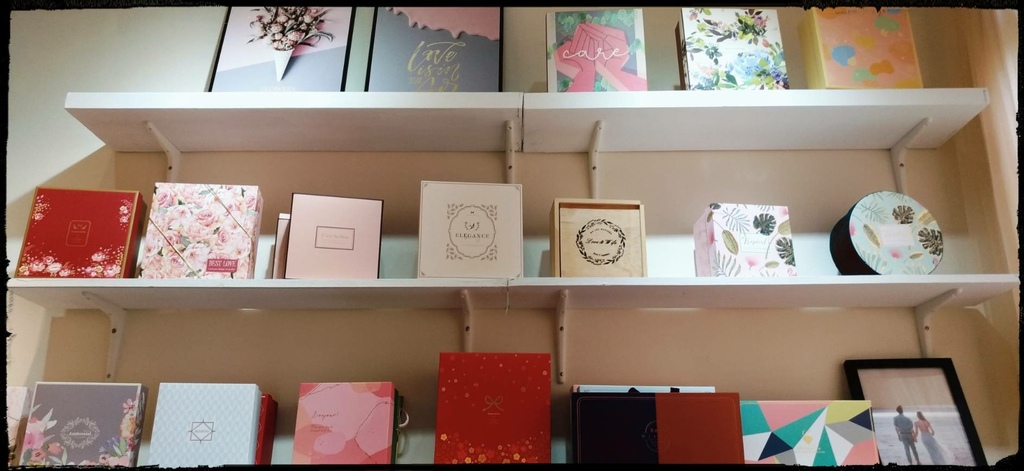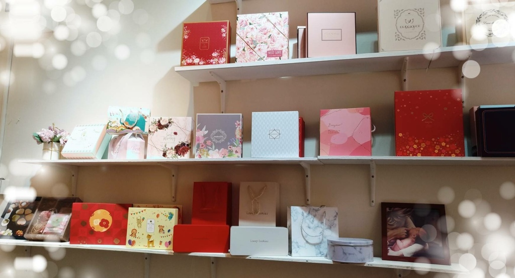 牆上擺滿許多精心設計的客製化禮盒款式 , 精美到每一種盒子都讓人愛不釋手的藝術品 , 送禮也送到心坎裡!