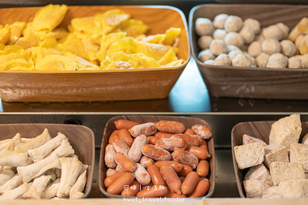 火鍋食材的部分有:魚餃、燕餃、小貢丸、芋頭、米血、手工蛋餃、南瓜、黑輪、蒟蒻條、玉米等。