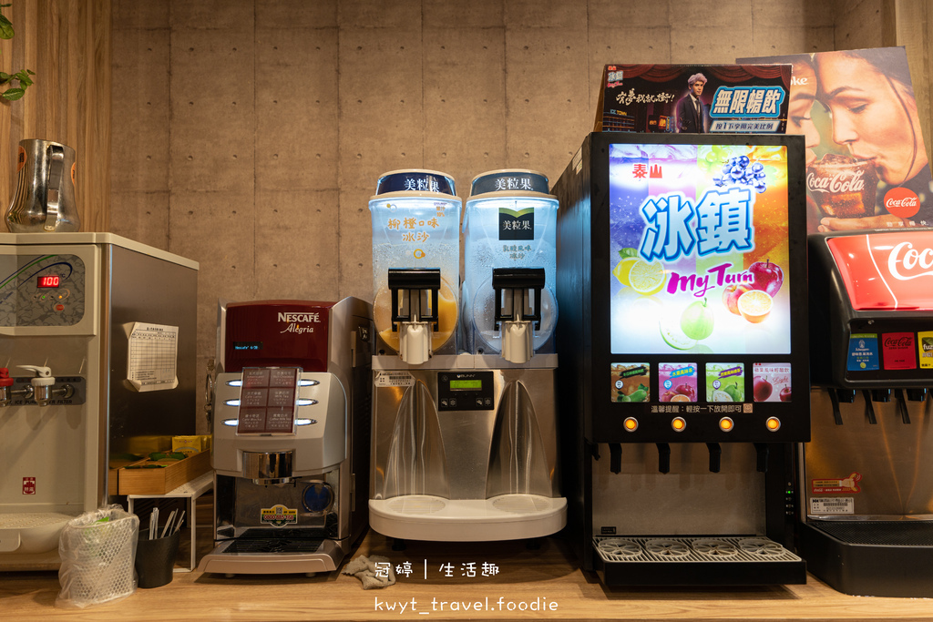 自助飲料吧有:6款氣泡類飲品、兩種口味的冰沙、6款飲品咖啡機、熱茶。