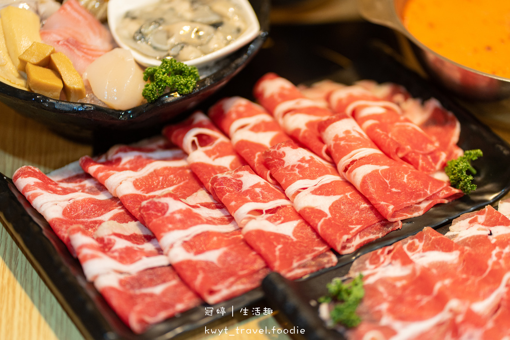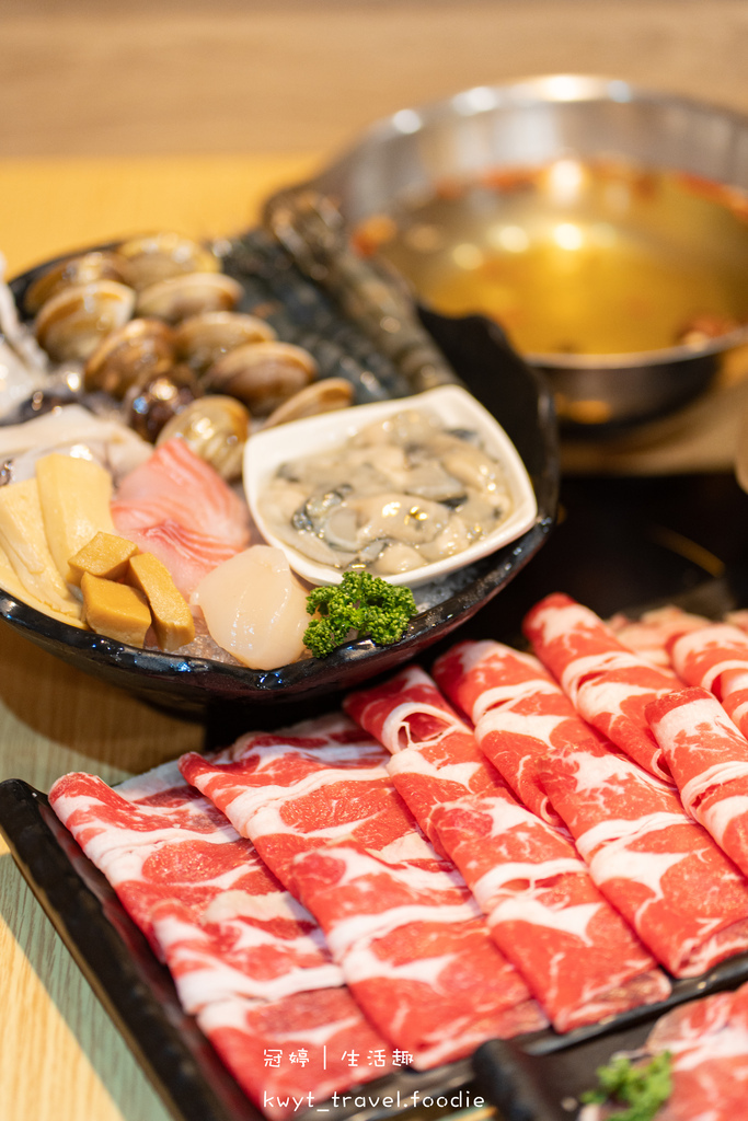 海鮮大總匯鍋搭配的肉盤有:霜降牛、松阪豬、嫩肩羊三選一。