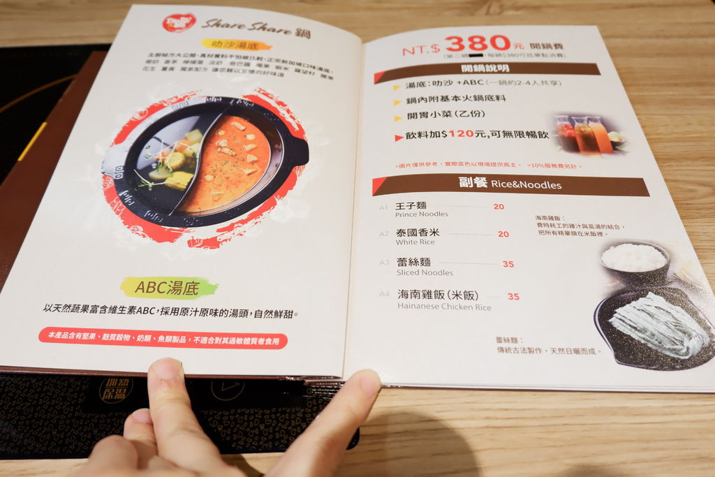 新加坡叻沙shareshare Pot南洋鍋物的服務態度非常非常好,會收服務費,親切又認真專業,光是開幕前為了這家火鍋店就籌備足足半年以上,而且菜單也讓人感受到絕對不只是坊間普通的火鍋店,來新加坡叻沙shareshare Pot南洋鍋物,可以享受到選用低溫舒肥作法的海南油雞腿,吃來軟嫩多汁,還有王子麵、道地泰國香米、蕾絲麵、海南雞飯可以選擇當副餐!