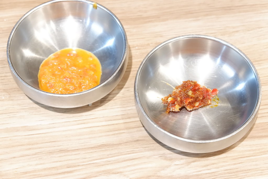 左邊是海南雞辣椒醬,右邊是東南亞料理常見的特辣參芭醬,非常涮嘴,加一點香菜、花生粉沾著火鍋料一起吃,非常痛快又享受!