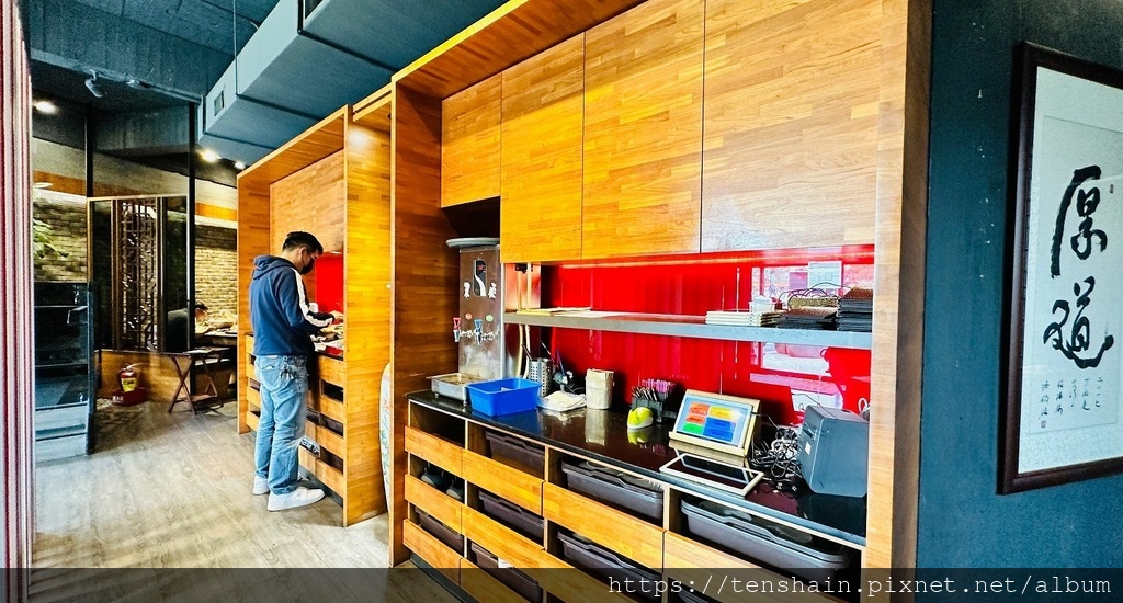 玄關格柵之後,是餐具台和醬料區。「岩漿火鍋-新竹經國店」的環境整理得很乾淨,讓我感覺很安心。