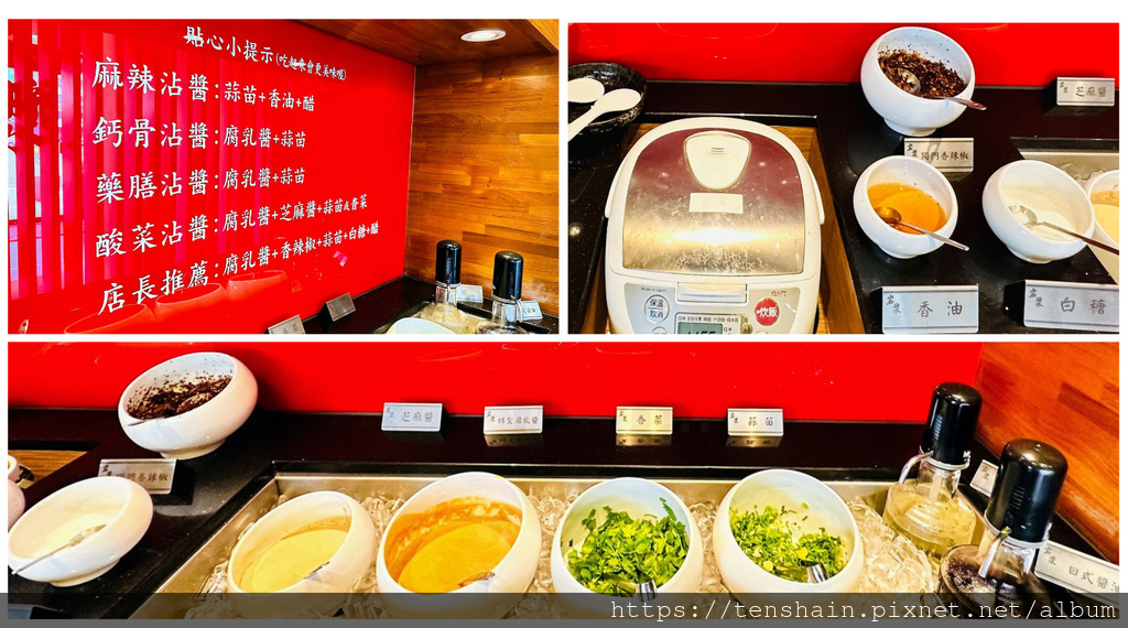 醬料的選擇不算很多,但是味道很有特色,尤其是牆面上的「貼心小提示」,針對不同的湯底,設計出最適合的沾醬,由此可以看出店家的用心!小女兒按照建議如法炮製麻辣沾醬,試沾之後,果然讚譽有加!