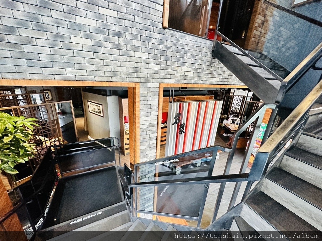 「岩漿火鍋-新竹經國店」有兩層樓,串連的樓梯相當寬大,曲折通幽。