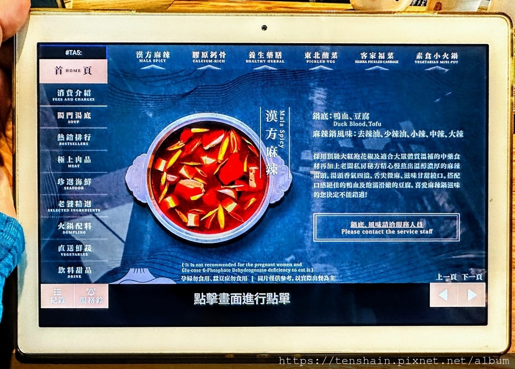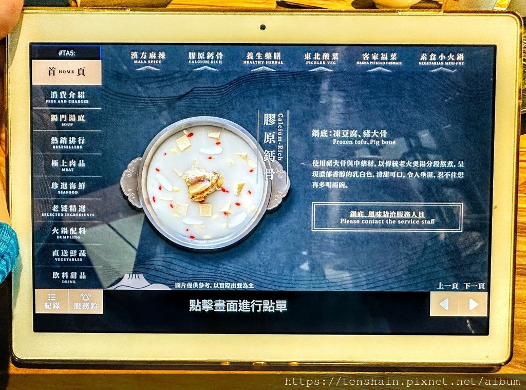 「岩漿火鍋-新竹經國店」的點餐方式跟得上時代,每桌都有專用的 iPad ,不必一次點完所有菜色,可以根據自己胃量隨時加點,非常方便。點菜的介面不但分類清楚,而且設計得很有質感。左下角有「服務鈴」按鈕,需要加湯底或是其他服務時,點一下畫面就行。