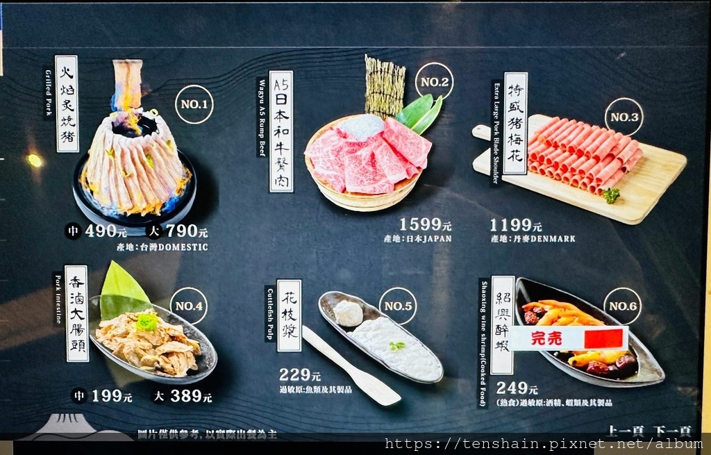 選好湯底,接著就要開始點餐了!先看看店家推薦的菜單,NO 1. 的「火焰炙燒豬」必點,因為這是「岩漿火鍋」的招牌菜,也是店名的由來。花枝漿看起來也很不錯,我喜歡。