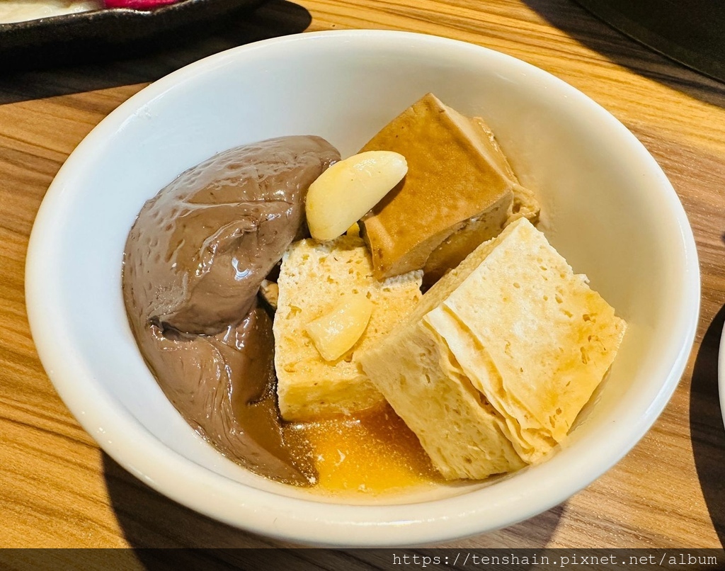 「漢方麻辣」湯的鍋底是鴨血和板豆腐,鴨血超厲害,滑嫩細緻且沒有一絲腥味。板豆腐煮得非常入味,鹹香迷人。兩者的辣度都不高,即使不太吃辣的我,也可以接受。「膠原鈣骨」湯的鍋底是凍豆腐,凍豆腐蜂巢狀的結構,吸飽了膠原鈣骨湯汁,每咬一口湯汁就噴射出來,滿口馨香,口感絕佳,連豬大骨都能無限續加,就知道熬湯下了重本,完全真材實料。