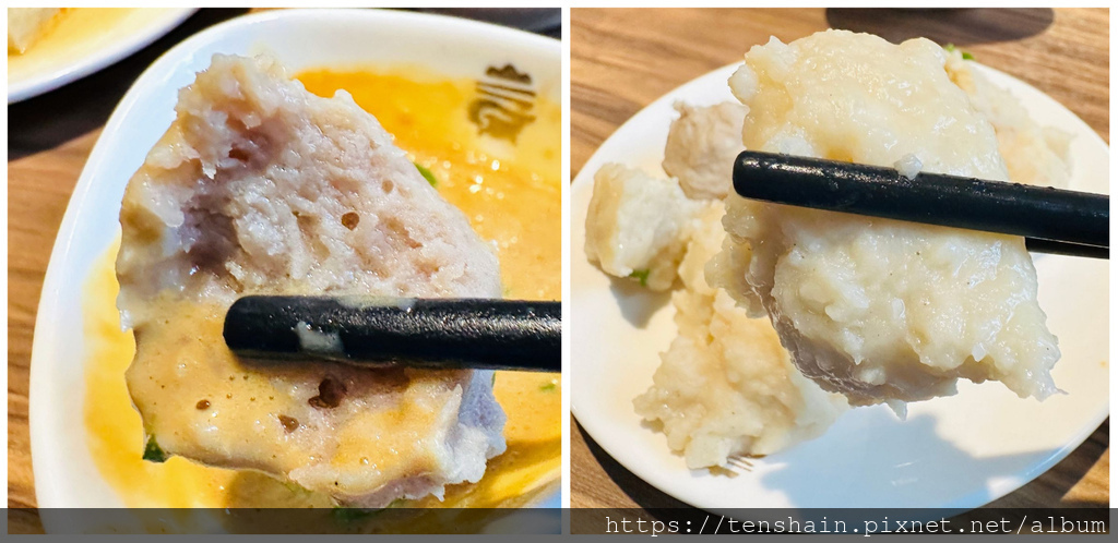 芋頭貢丸連原來不敢吃芋頭的小女兒都稱讚有加,喜歡吃芋頭的老婆更不用說了,吃得不亦樂乎!因為鬆甜的芋頭塊,有效的中和豬肉的油膩感,讓貢丸變得只有肉香,完全沒有豬臊味的美味。花枝漿我比較愛,因為一塊塊花枝超 Q 彈,咀嚼時鮮甜無比,完全不用沾醬就很好吃。