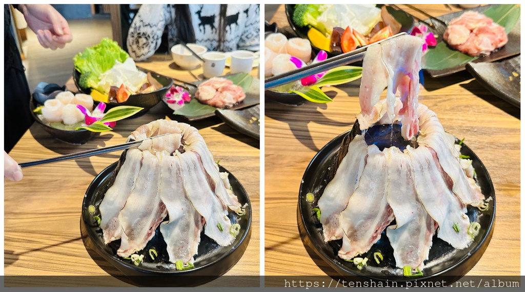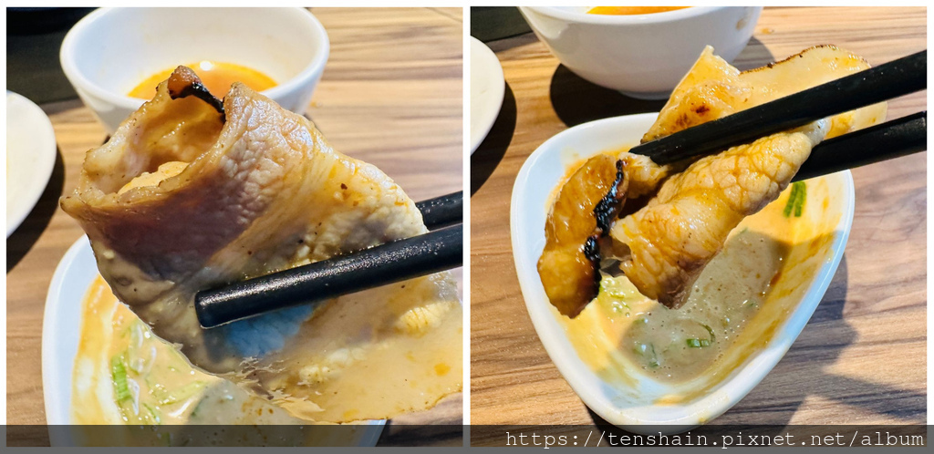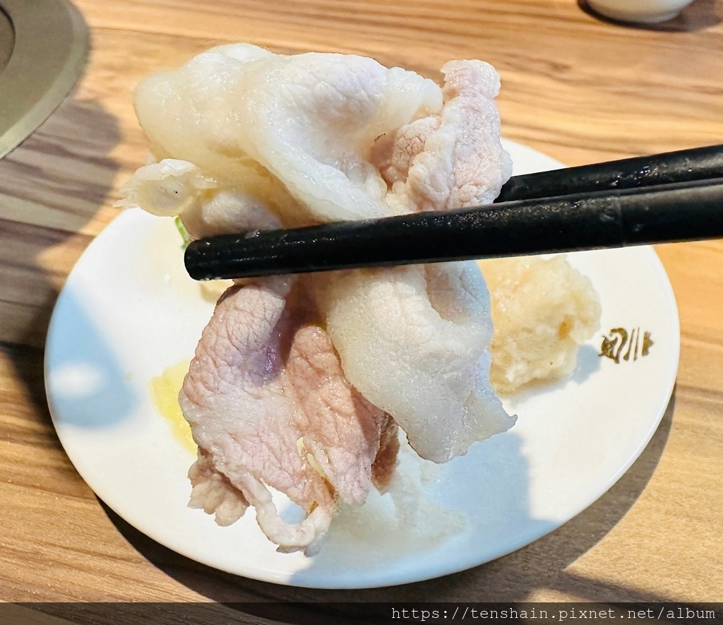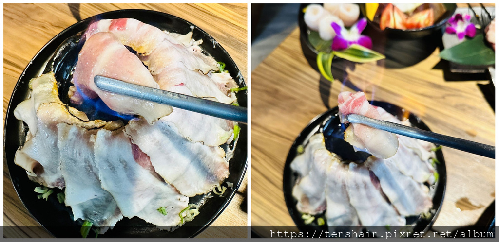 你可以控制豬肉炙燒的程度,喜歡焦一點的口味就炙燒久一點,喜歡吃嫩一點的口感,就把炙燒時間縮短。記得炙燒後,還是要丟到火鍋裡面煮,畢竟豬肉一定要煮到全熟才可以吃。