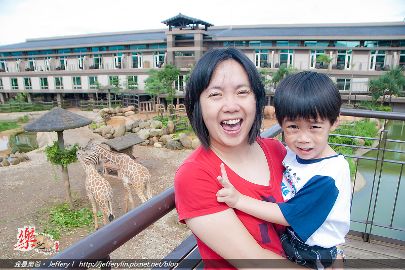 要欣賞這些動物, 除了可以住在靠近各類動物的房間外, 還可以藉著飯店在中庭內搭建的天橋步道上觀賞, 上圖是樂媽和阿成與長頸鹿的合影留念, (如上圖), 只不過天氣太熱, 太陽太大讓阿成睜不開眼睛了。