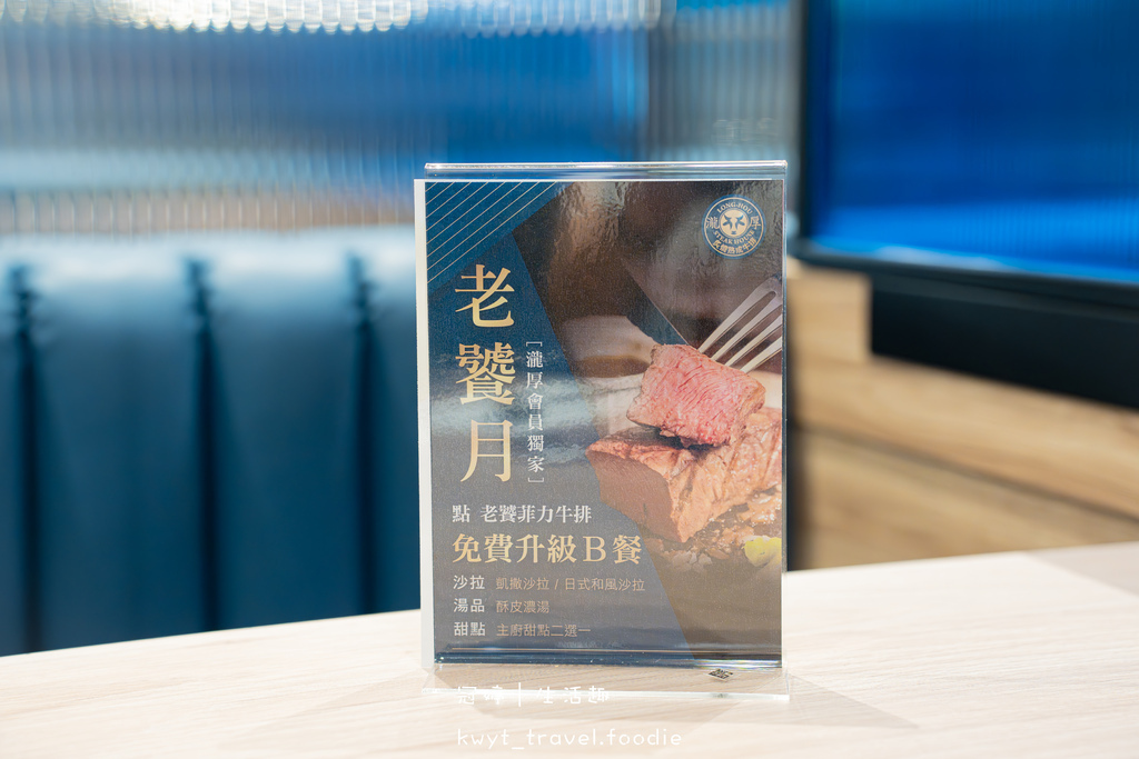 瀧厚會員獨家優惠:老饕月,點老饕菲力牛排,免費升級B餐 (沙拉二選一 + 酥皮濃湯 + 主廚甜點二選一)