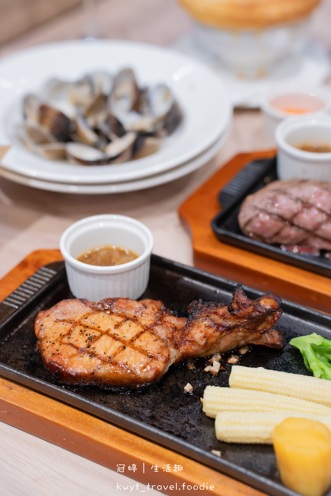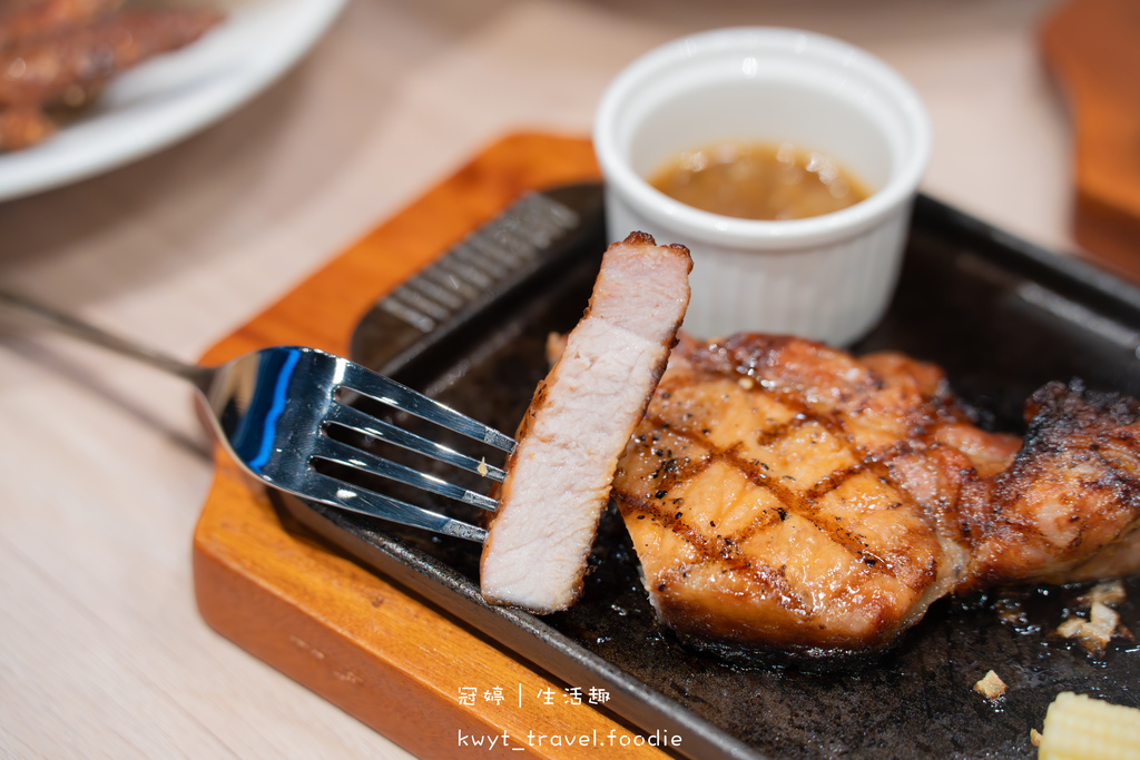 以炙燒戰斧豬排為主體,搭配嚴選高品質蔬菜:青花菜、玉米筍、洋蔥,與地瓜、獨家黑胡椒醬呈現。