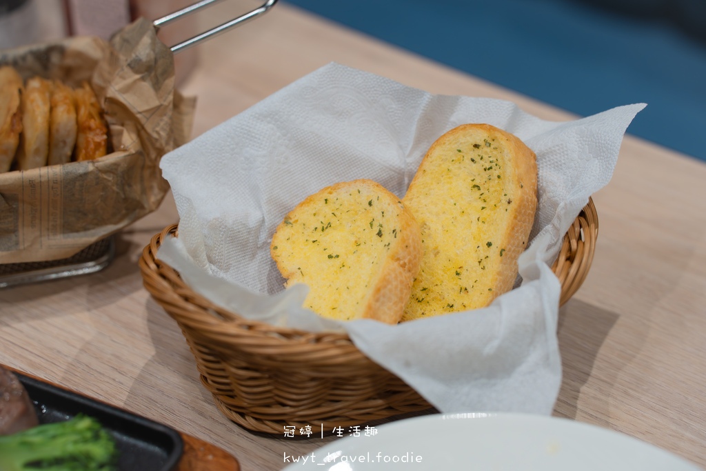 加熱後上桌的麵包呈現外皮薄脆內裡保有軟綿口感,可以吃到添加香蒜奶油醬的濃郁蒜香味。