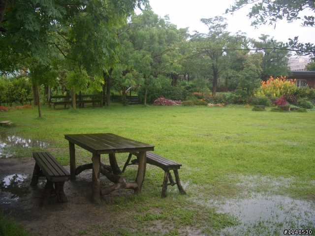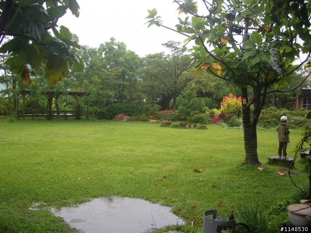 前方建築物裡有一群小朋友在辦活動,雨後的庭園蠻漂亮的