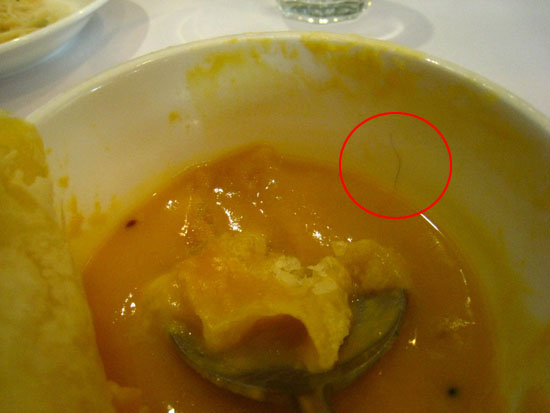 小吠湊過去一看,發現碗壁上有根不明毛髮!!(圖中紅圈處)