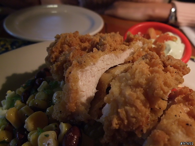 厚實的炸雞胸肉下,鋪著數種清爽蔬菜,拌著乾培根、起士絲等,真是一道色彩鮮豔而如其名的德州七彩沙拉。佐著不甜膩的酪梨醬,那頗為乾澀的雞胸肉,有口救贖的滋味。