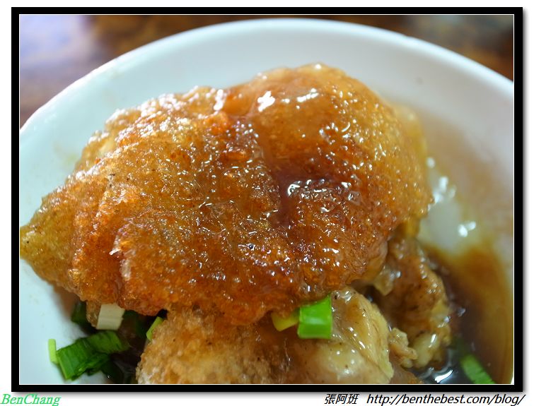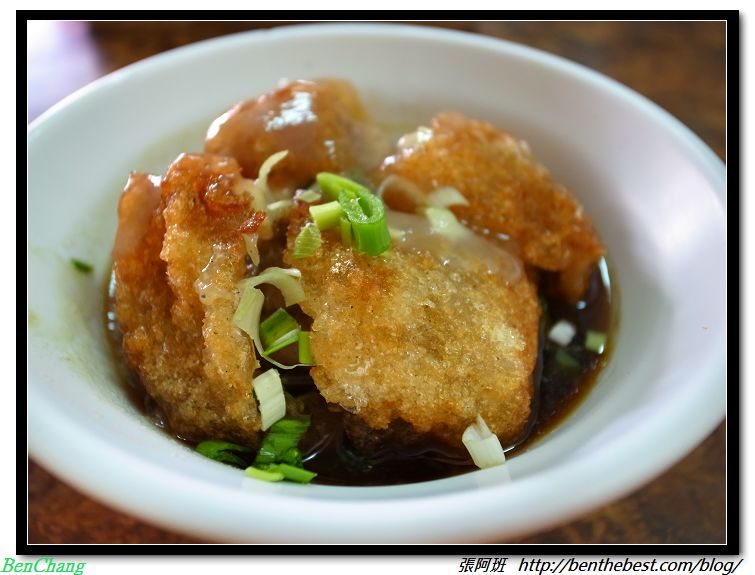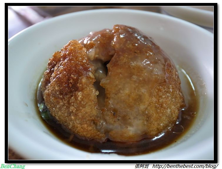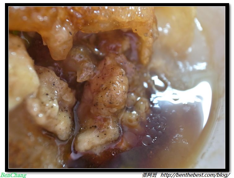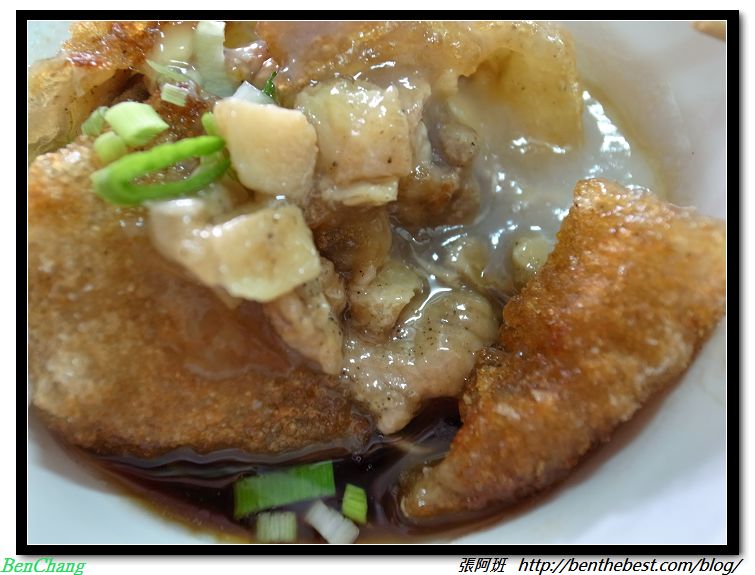 是的不用懷疑就是破表。外皮酥脆的程度不但不輸北門口,還帶有種更特別的Q感在內裡,完全有讓我驚訝到的感覺。內餡就更不用說了,醃的很入味的肉加了很多的胡椒,味道整個讚,勾上一點點的芡吃起來像肉羹的感覺,是張阿班第一次吃到的,很特別很好吃。衝著這特別與驚訝度,六顆星當之無愧。