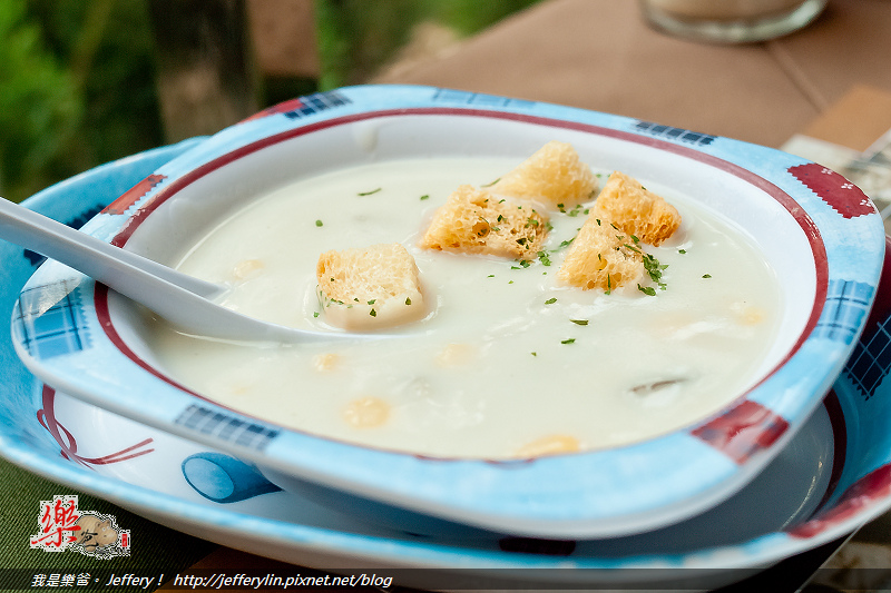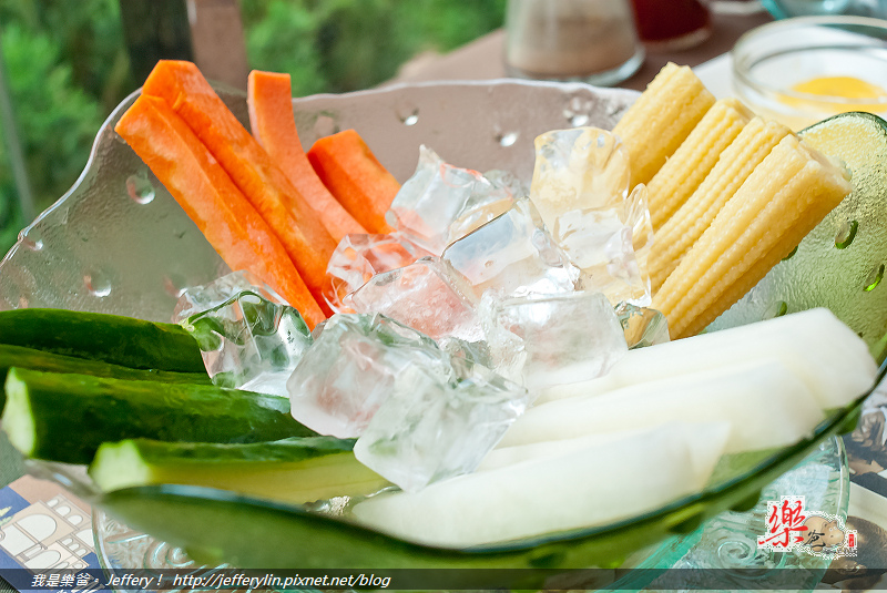 隨後餐廳即送上一道"鮮脆時蔬優格沙拉", (如上圖)。這道沙拉完全是採用新鮮的蔬菜棒構成的, 特別是那紅蘿蔔, 其實樂爸很討厭單吃紅蘿蔔, 原因是不喜歡它的腥味, 不過, 這裡的胡蘿蔔似乎讓樂爸感受不到那討厭的味道, 反而是鮮脆而爽口。