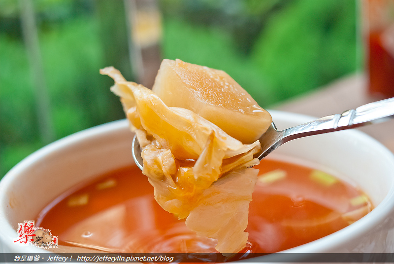 這道"蔬菜湯", (如上圖), 是用蕃茄與多種蔬菜下去熬煮的, 裡頭有高麗菜、白蘿蔔、蕃茄...等, 湯頭滋味清甜而鮮美, 在享用主餐前也有種開胃的效果。