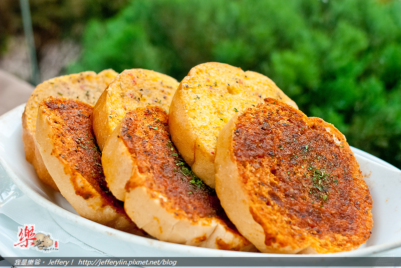 這""義式田園風味麵包"一共有二種口味, 分別為"法式香蒜"與"義式香料", (如上圖), 其中"義式香料"略帶點微辣, 雖說有點辣, 我看阿成大概是餓了, 不管三七二十一就是大口大口的吃, 一邊喊著辣辣, 一邊還是繼續吃, 真是有趣, 不過, 這也難怪, 因麵包烤的香酥脆, 剛好對上了阿成的胃, 呵~而且, 服務人員還很貼心的交代, 若是之後覺得麵包變軟了, 想再吃熱熱脆脆的話, 可以再請他們幫忙再烤一下喔!