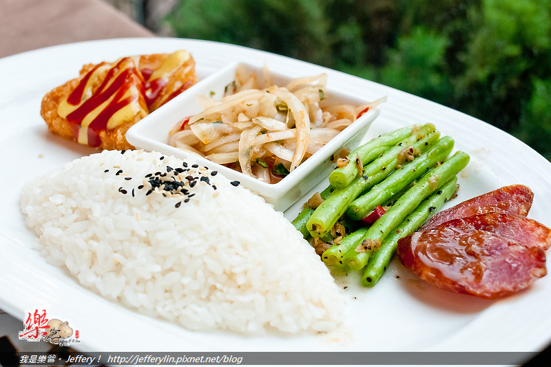當然, 每一道主菜都會配上一盤配菜及白飯, (如上圖), 今天的配菜有四季豆、香腸、洋蔥絲及薯餅, 其中那洋蔥絲有點像是酸甜的涼拌菜, 滋味也很好。